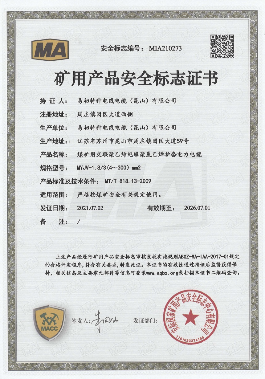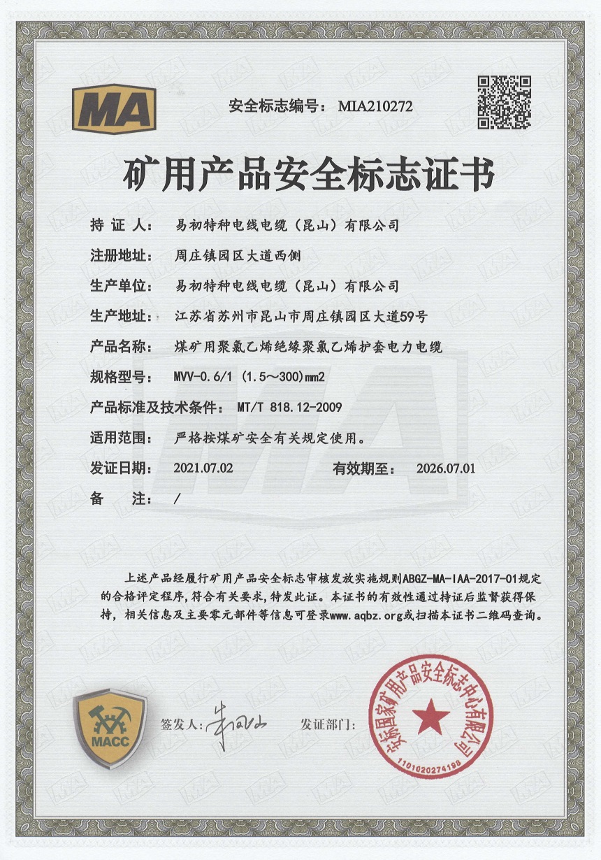 矿用电缆安全证书